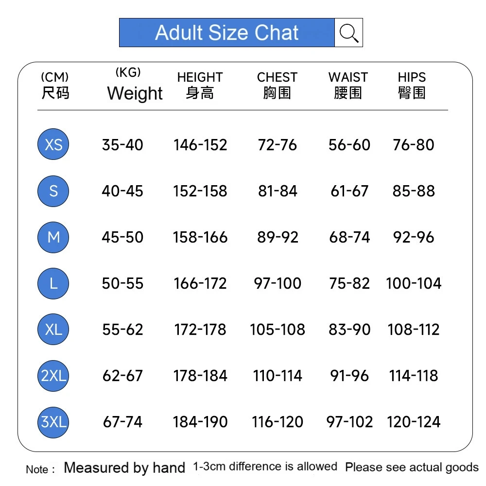 For Adult: XS-3XL , For Kids: 110-150 |